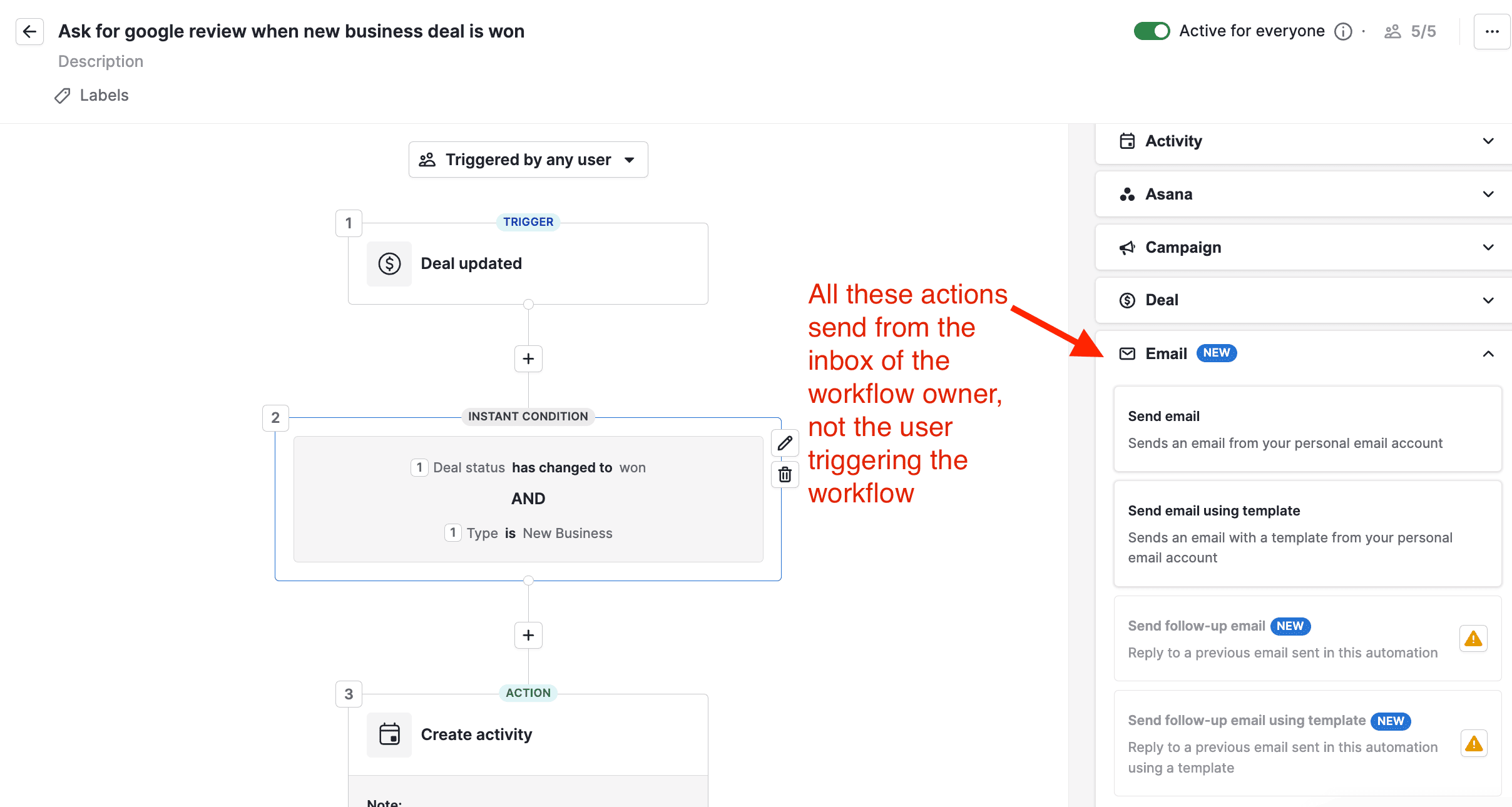 Which means you can now have one workflow automation to send emails properly from the respective user’s inbox.
