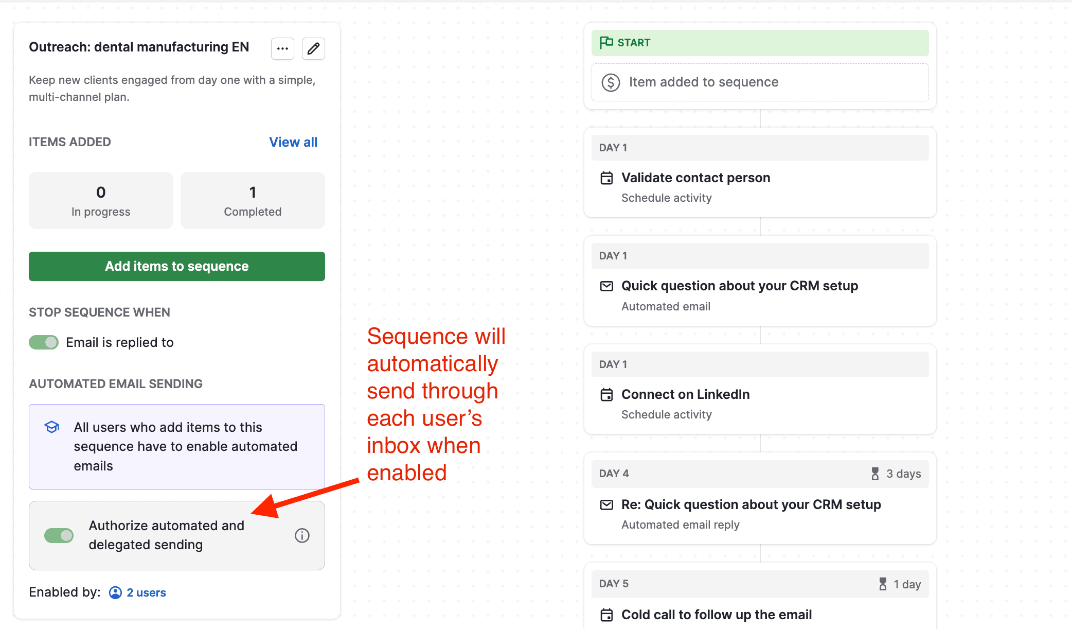 Emails of a sequence then go out automatically, from an account of respective user, when their deals or leads are added to a sequence.