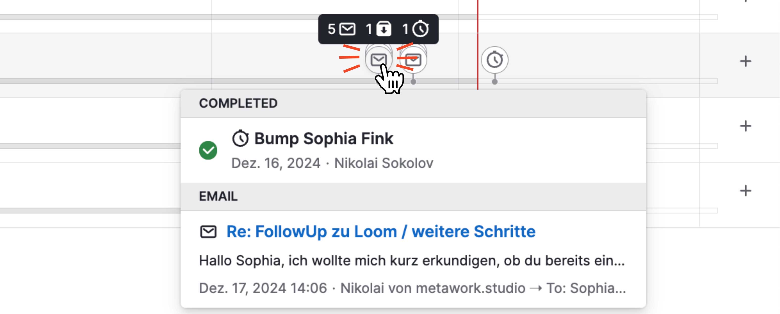It shows when and how someone was last contacted, how many emails and calls were exchanged, and which deals or projects are currently in progress.
