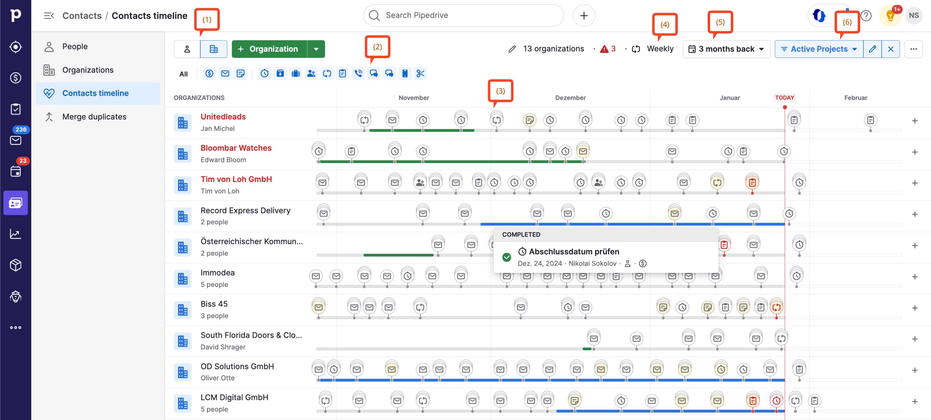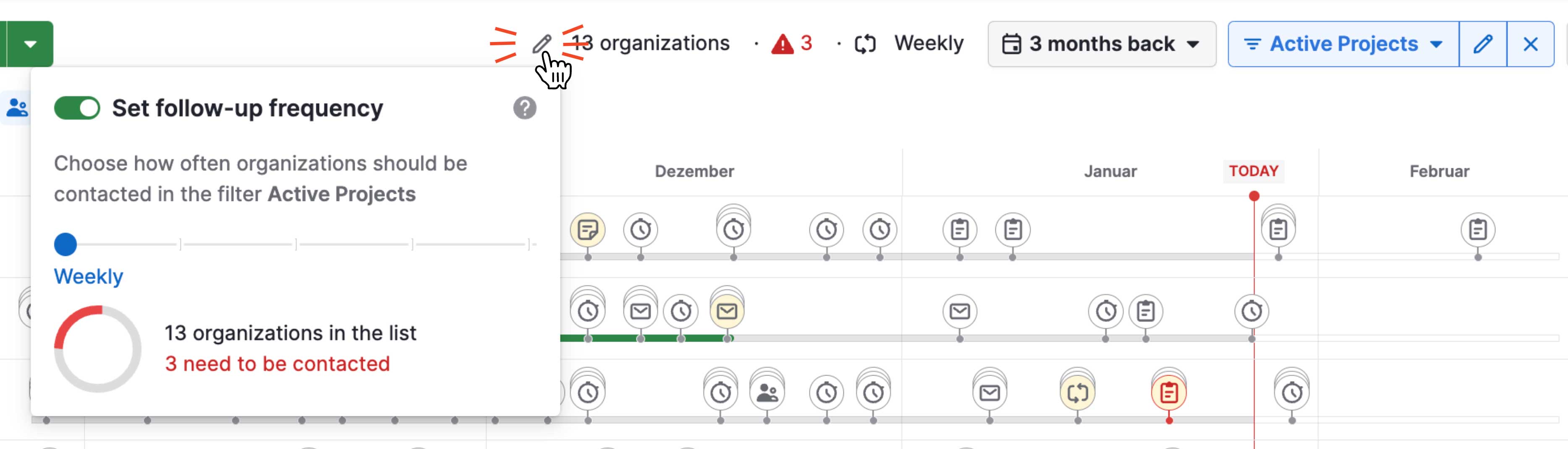 You can specify how often you want to contact them (4), how far back the timeline should go (5), and how to additionally filter contacts or organizations (6).
