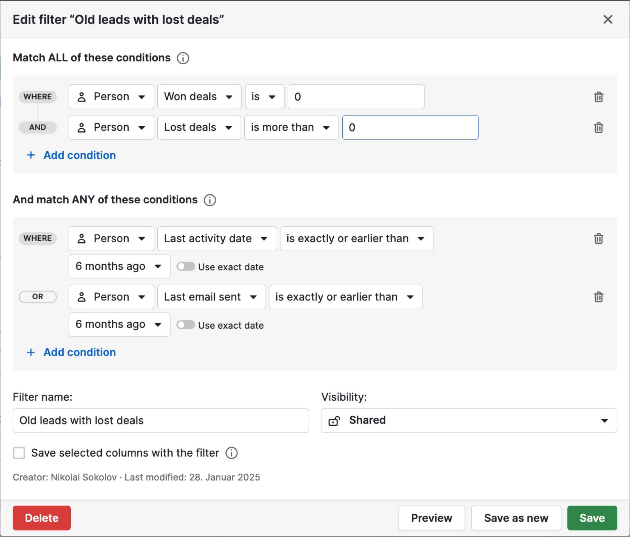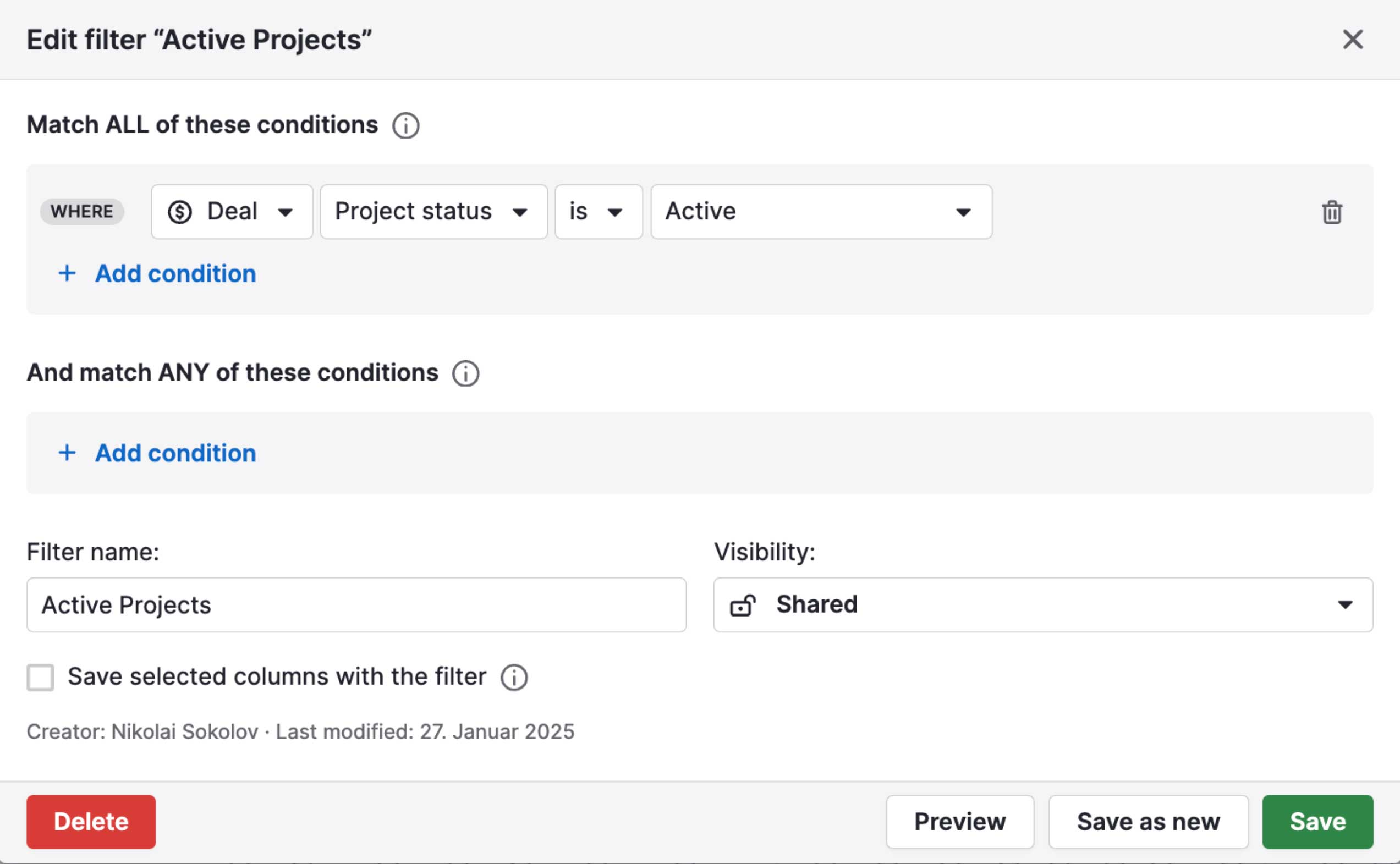 Filters allow you to narrow down which leads you want to keep track of and which offers or projects need your attention.