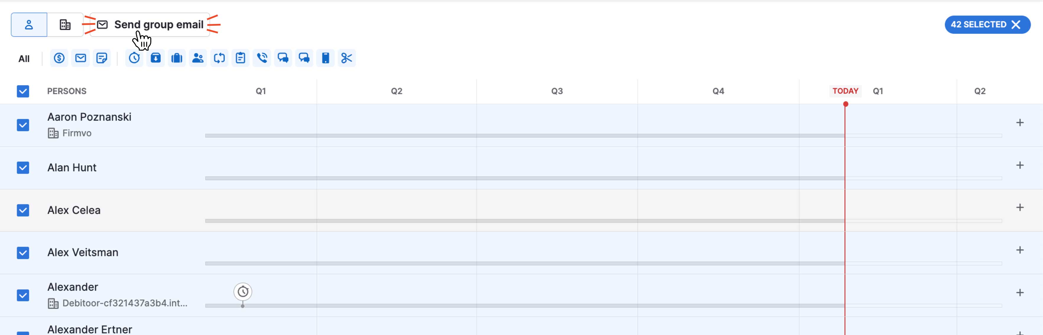 Launch a small email campaign using the “Send group email” feature and schedule appointments directly from the Timeline. Simply select the desired individuals (or select all) and click the Send group email button.