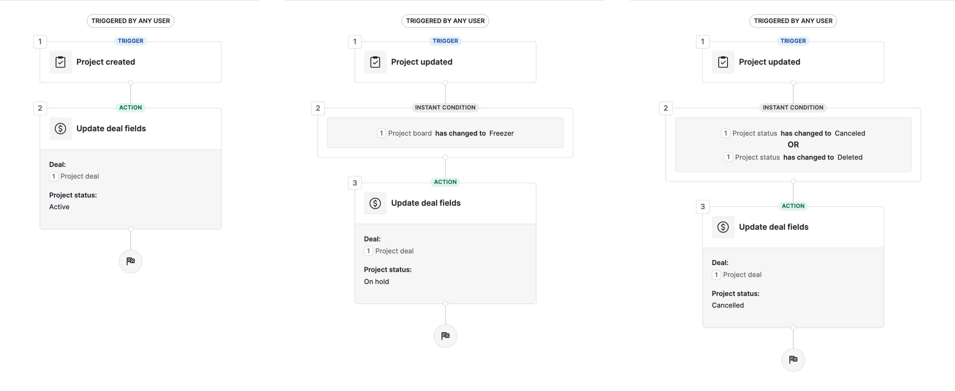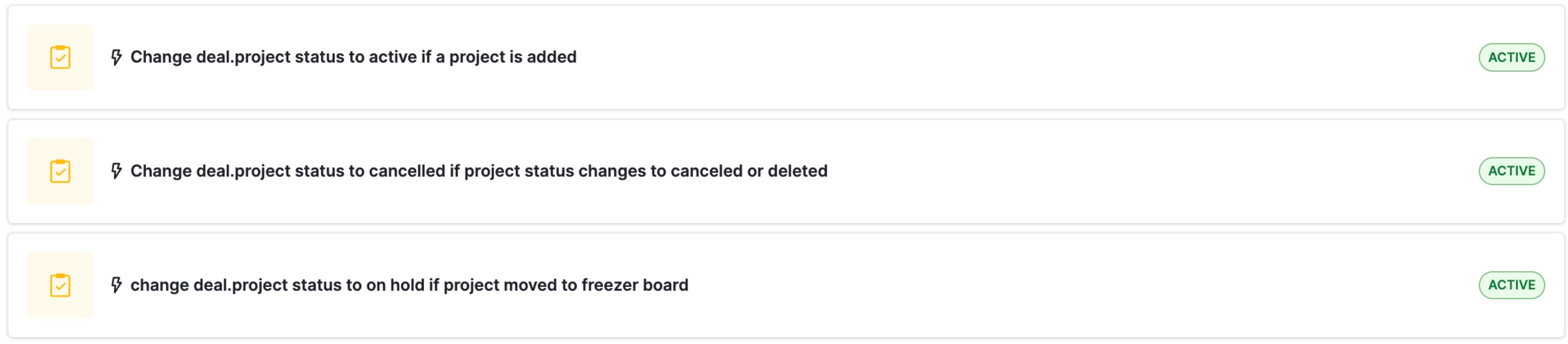 Next, you need to set up the project-related workflows. They are super simple: when a project is created, set the deal’s status to “In Progress,” and so on.