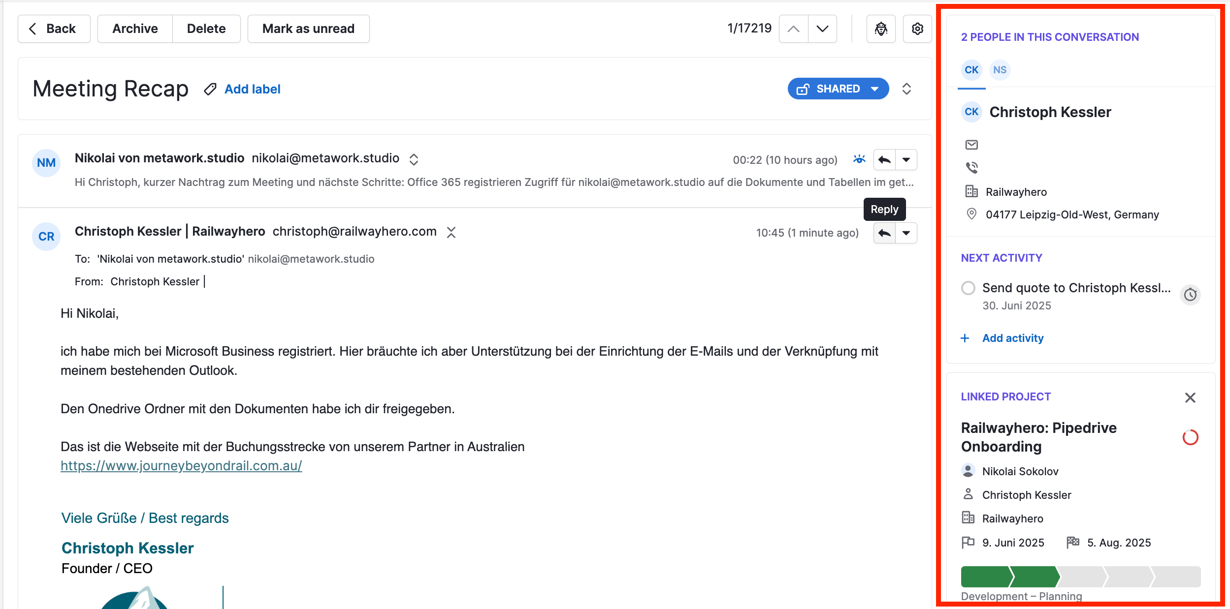 - In the upper part, you see if the sender and people in CC are already linked to contacts. If not, you can create the contact with one click (recommended if the email traffic should be visible in other views).