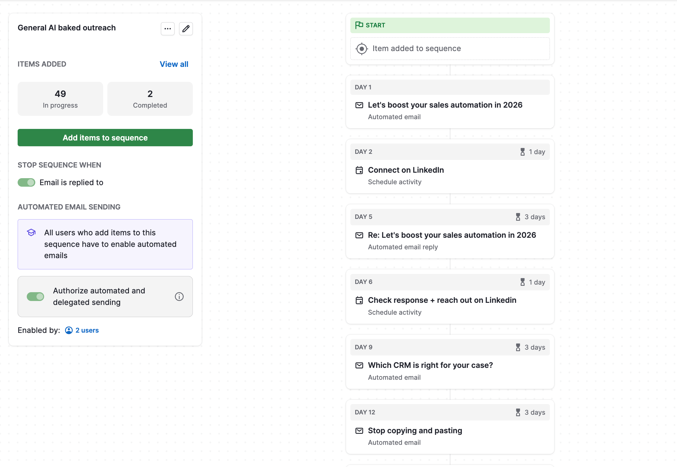The most important thing: Sequences can be sent from the respective user’s inbox, which is very useful. In Workflow Automations, this is a hassle, but with Sequences, it’s no problem at all. This video explains the maintenance difference between Sequences and Workflows:
