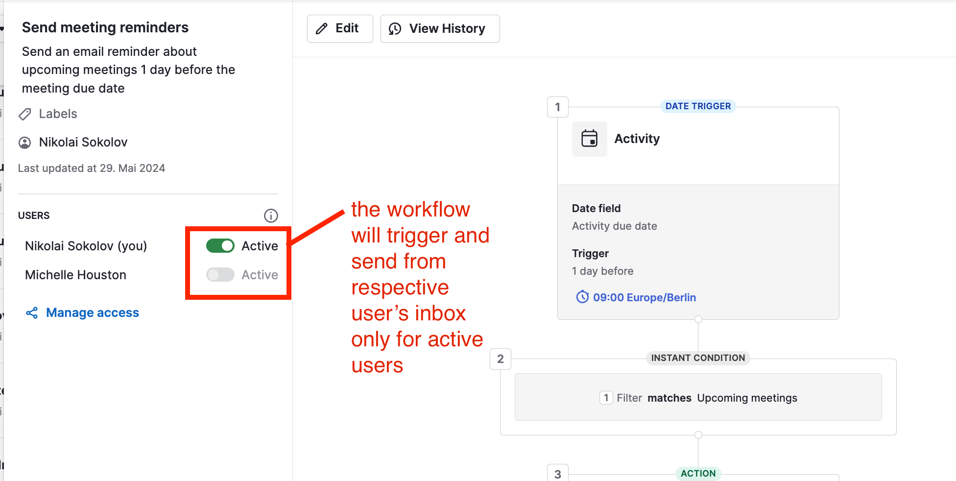 - If the email should go out from the sales representative’s mailbox, the sales rep must duplicate the workflow and activate it for themselves.