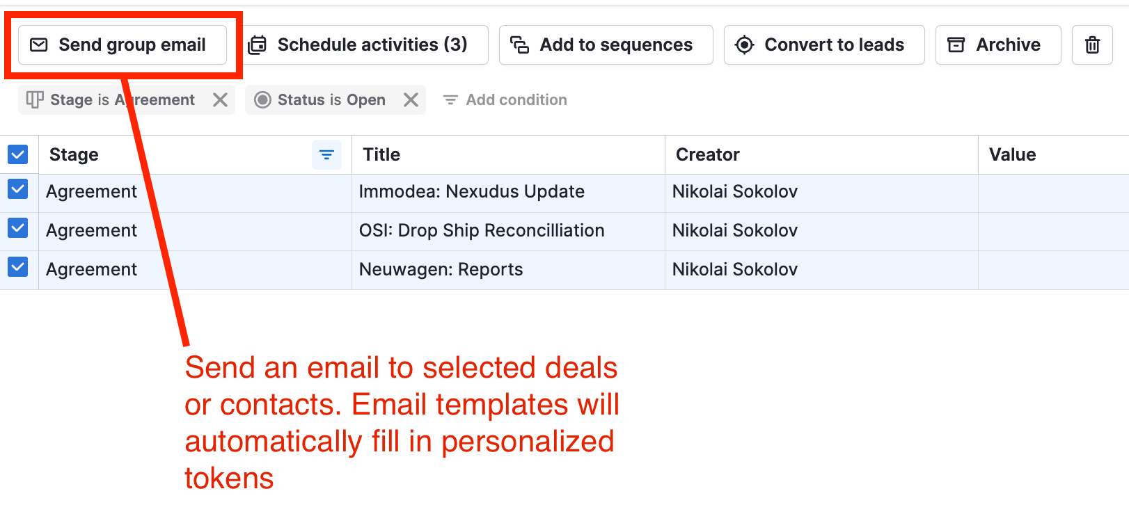 In Pipedrive, it is a matter of 3 clicks to send an email to 100 people. Select > Click Bulk Send > Check and Send.
