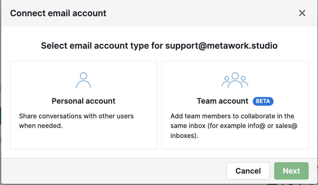 When setting up email accounts, you can choose between a personal and a team mailbox: