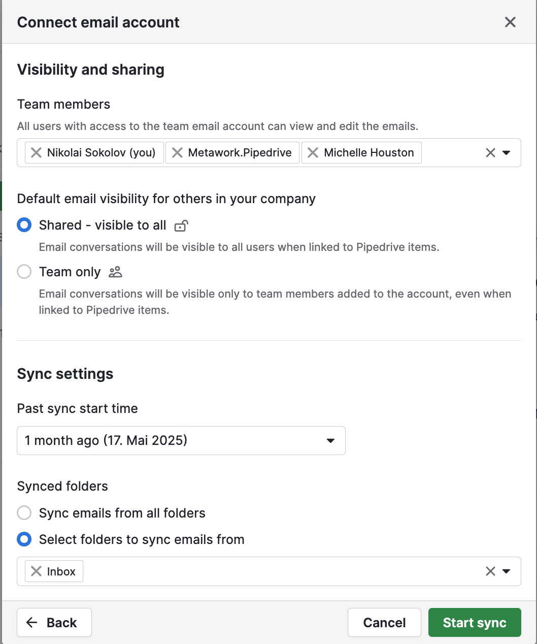 In Pipedrive, during email connection setup, you activate how far back emails should be synchronized. Up to 2 years works out of the box. Significantly further back is possible via Pipedrive’s support. All emails from these years are imported and automatically linked to existing contacts in Pipedrive.