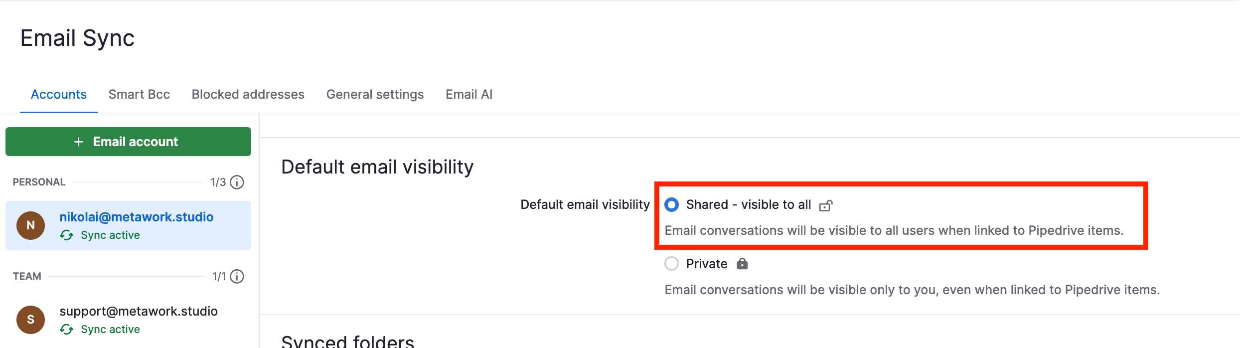 - All emails from your inbox are marked as shared by default, so that everyone on the team can see the content if they check the deal history.