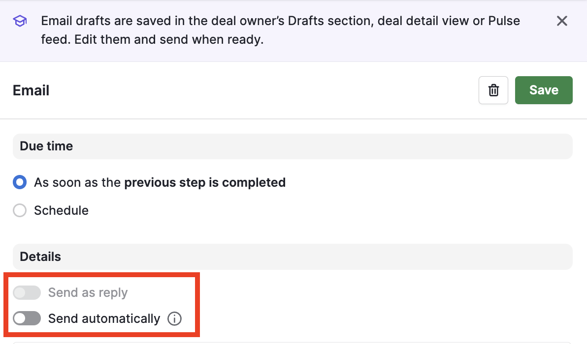 It is now possible to select between draft email and send immediately when setting up a sequence. Draft mode allows the user to tweak the email before sending it out during a sequence, which is sometimes necessary to make the email more personal or relatable.